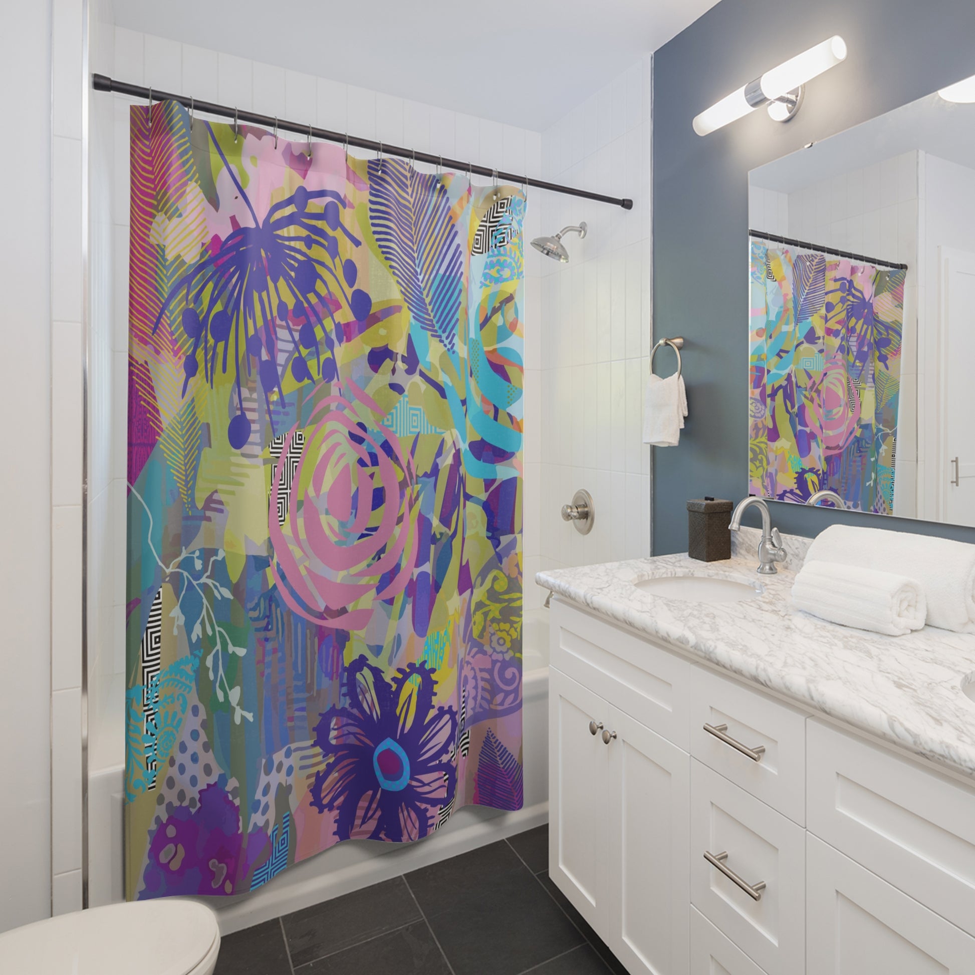 Jennifer is an interior designer, painter, and colorist and her designs reflect a joy of color. A favorite place to add a bold design is in a bathroom especially with a shower curtain because you get a quick update at a very affordable price point. Check out all the shower curtain designs HERE - there are many possibilities that will add a fun yet sophisticated pop of color to your bathroom and you support a small business artist by purchasing directly from Jennifer here instead of from the big box stores.